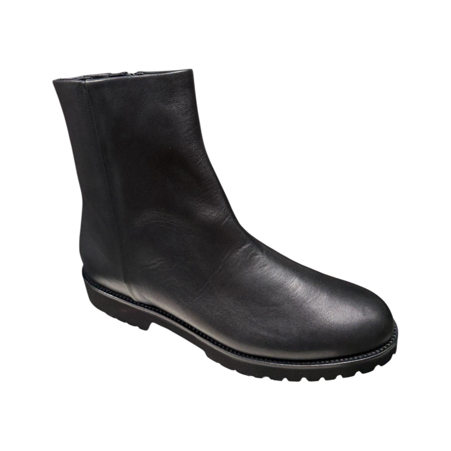 Sleek and refined, this ankle boot is crafted from soft nappa black leather with a smooth, luxurious finish. Designed for comfort and versatility, it features a lightweight construction and a good-grip sole for confident wear. The minimalist silhouette and low stacked heel make it an effortlessly stylish choice for both polished and casual looks.