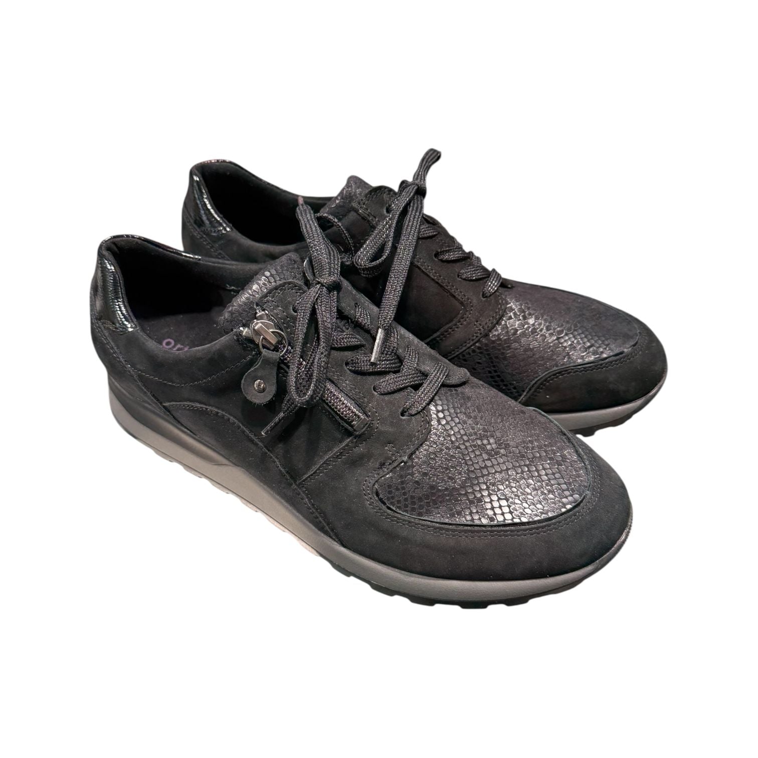 The Waldläufer Hegli Schwarz Stretch Sneaker blends sophisticated design with exceptional comfort. Crafted from a striking combination of nubuck, patent leather, and subtle snake-print accents, this black sneaker caters to sensitive feet with a spacious H-wide fit. Featuring a stretchy nubuck and textile insole, plus a soft padded lining, it supports all-day wear. Practical side zippers and laces simplify dressing, while a removable insole and lightweight, slip-resistant PU sole provide durability and ease, making it an elegant choice for fatigue-free walking.